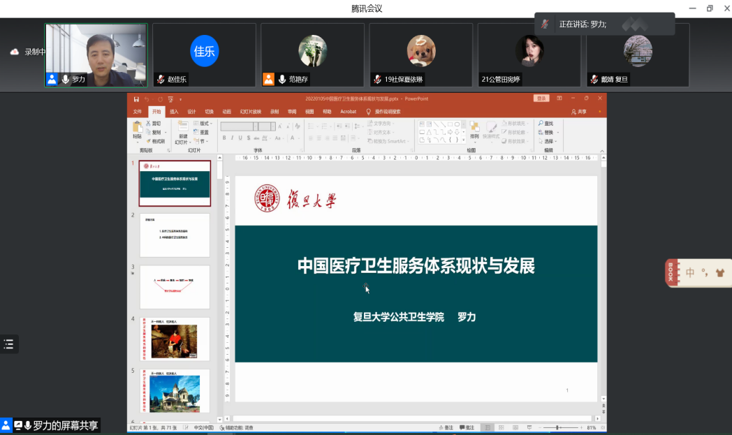 2022年3月25日晚,我院特邀复旦大学罗力教授为我院全体师生开展线上讲座。罗教授开展了题为“中国医疗卫生服务体系现状与发展”的讲座,卫生管理学院院长范艳存主持。